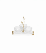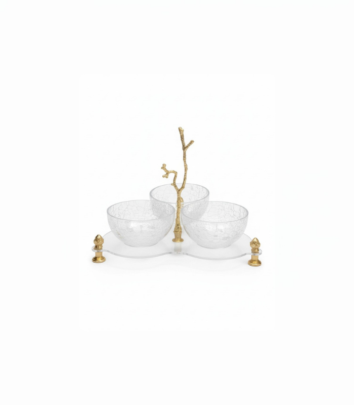 Presentiamo le nostre eleganti ciotole per snack in vetro, con un porta ciotole sopraelevato decorato con un rametto dorato centrale. Confezionate in un set di 3, sono perfette per servire i tuoi snack preferiti in modo raffinato e con stile. Aggiungi un tocco di eleganza ai tuoi spuntini con queste ciotole uniche.