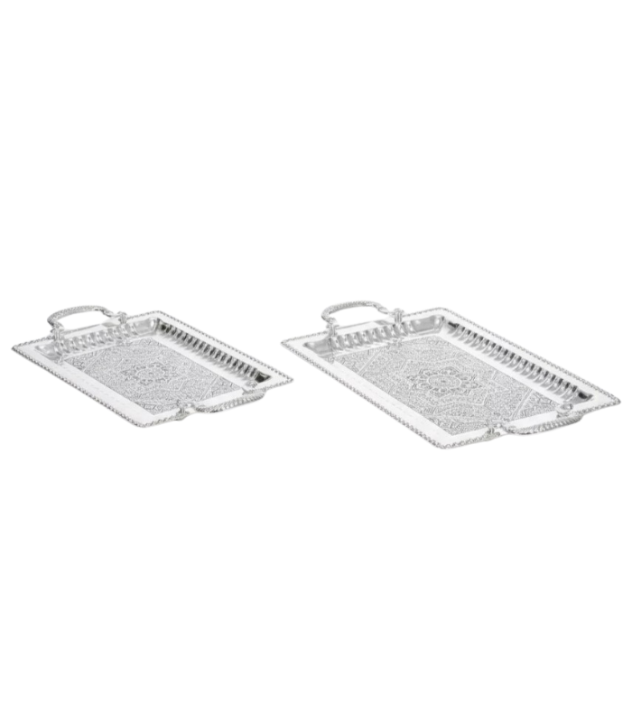 Realizzato in acciaio resistente, questo set di due vassoi presenta disegni intricati che elevano qualsiasi tavola. Perfetti per servire antipasti o esporre oggetti decorativi, questi vassoi aggiungono un tocco elegante ad ogni occasione. Porta stile e funzionalità a casa tua con questo bellissimo set di vassoi.