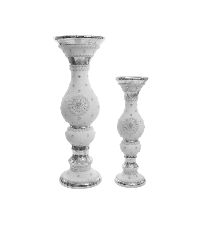 Aggiungi un tocco di eleganza e stile alla tua casa con il nostro vaso con decorazioni bianco. Scegli tra i dettagli specchiati in oro o argento per un tocco di lusso. Disponibile in due misure per adattarsi perfettamente ai tuoi spazi. Un’aggiunta raffinata per qualsiasi arredamento.